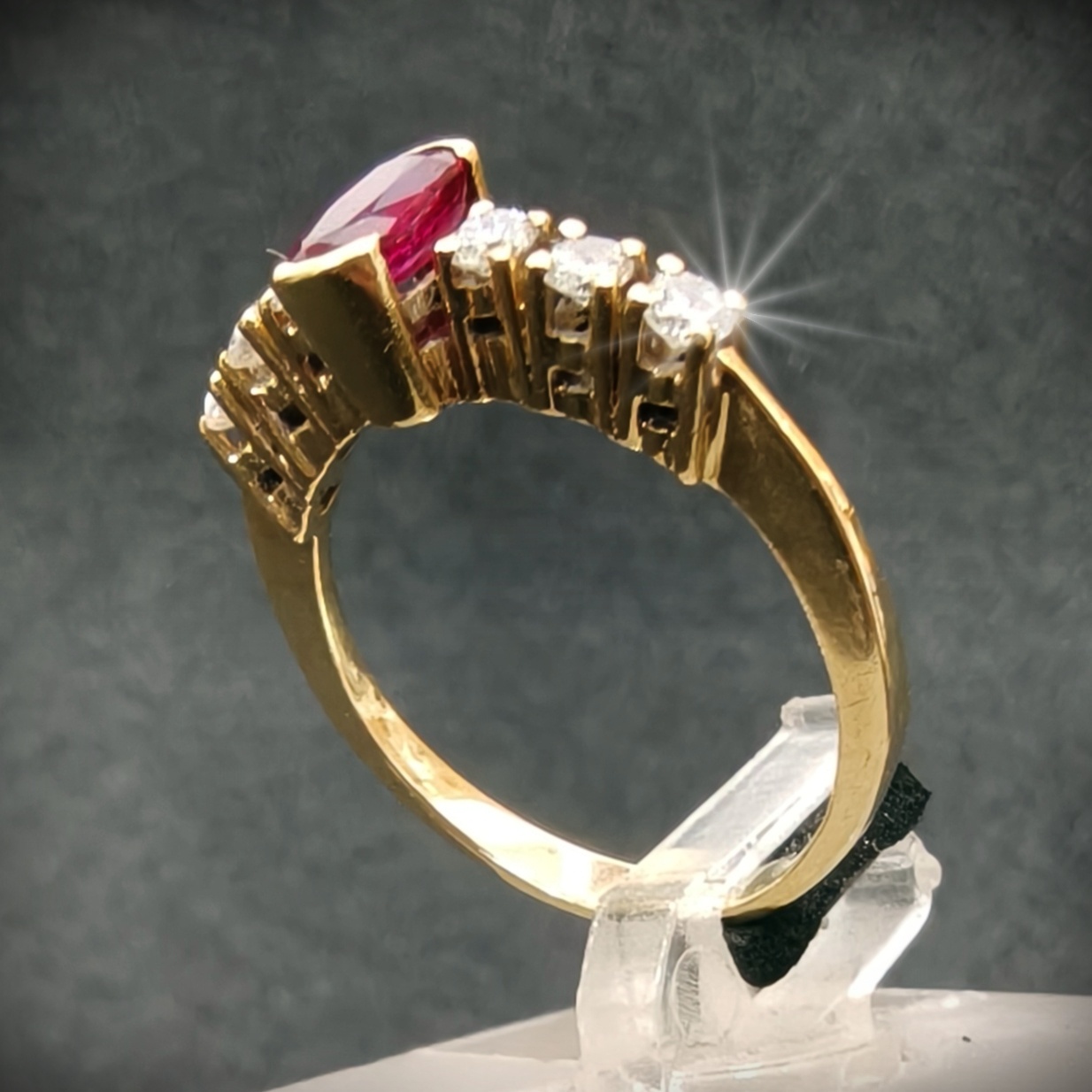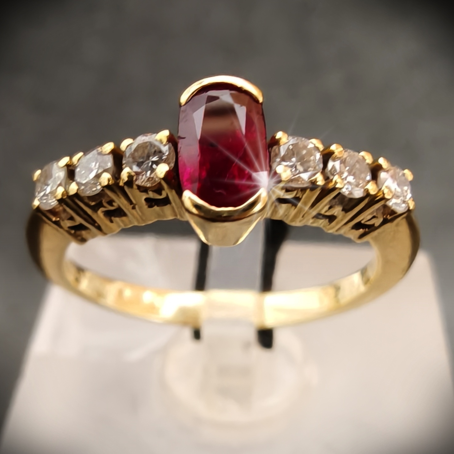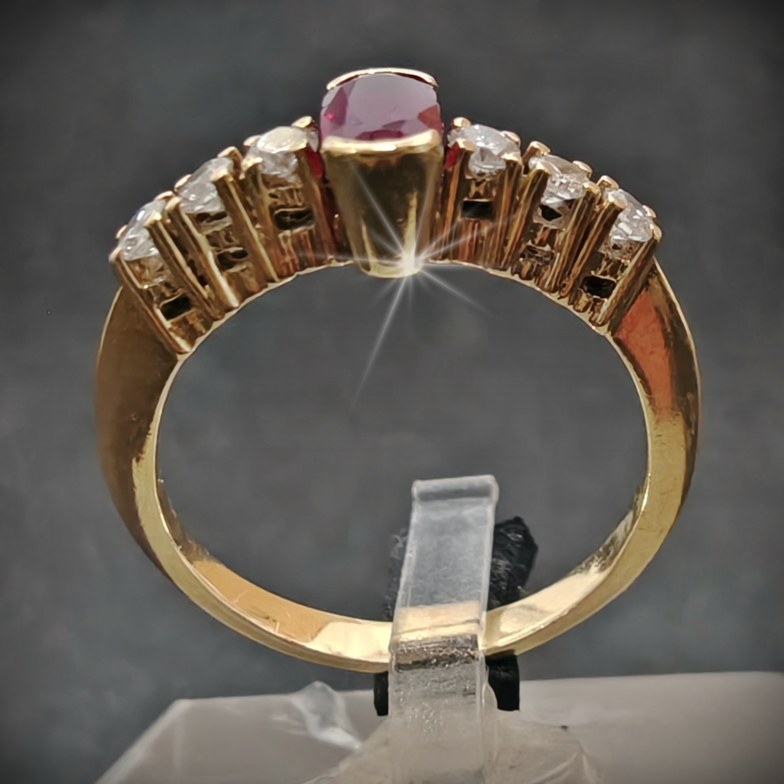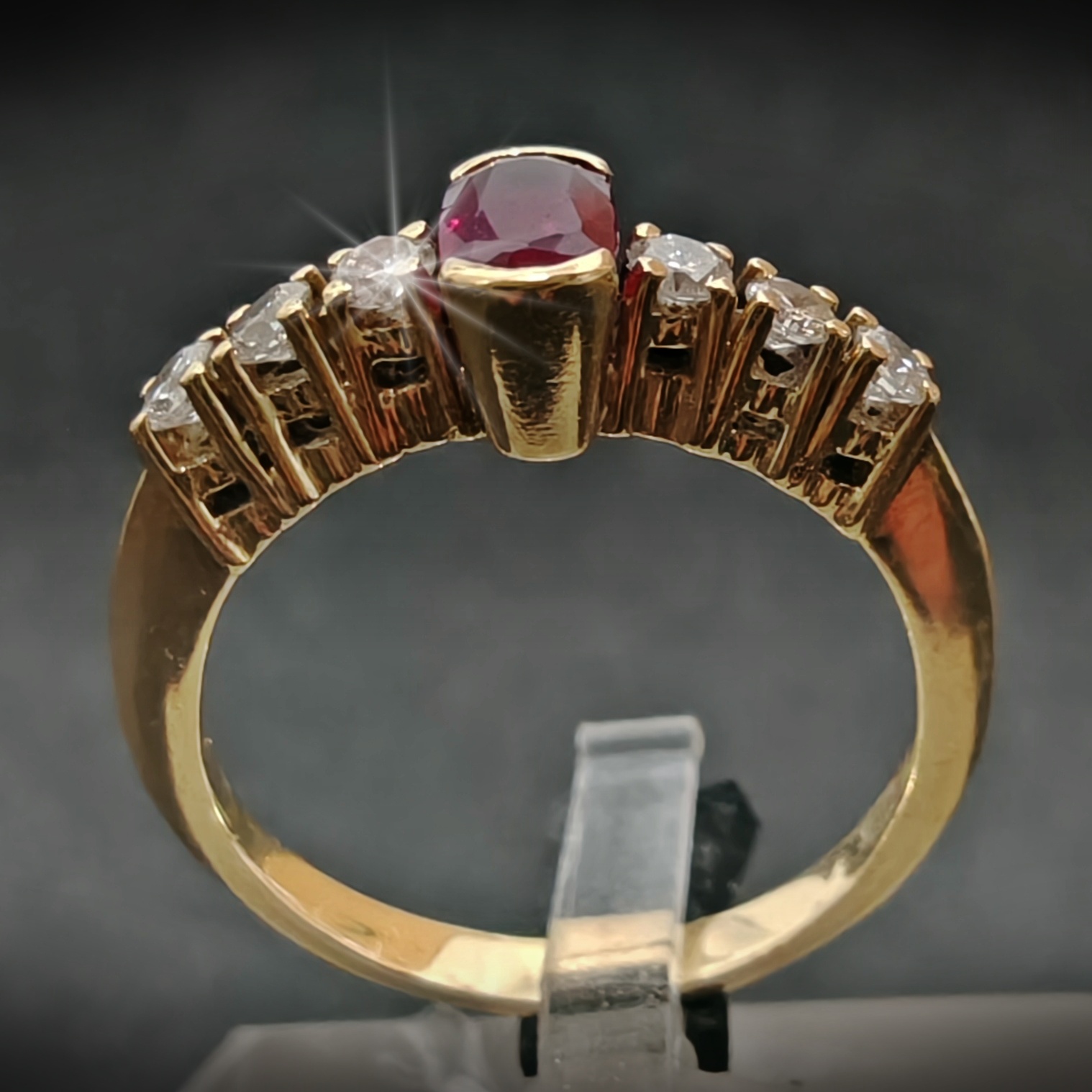 Anillo de oro con piedras color rubí y diamantes Tipo: Anillo. Género: Unisex. Material: Oro 18 K. Medida: nº 9. Peso: 2.49 gramos. Piedras: Diamantes. Estado: segunda mano, perfecto estado.