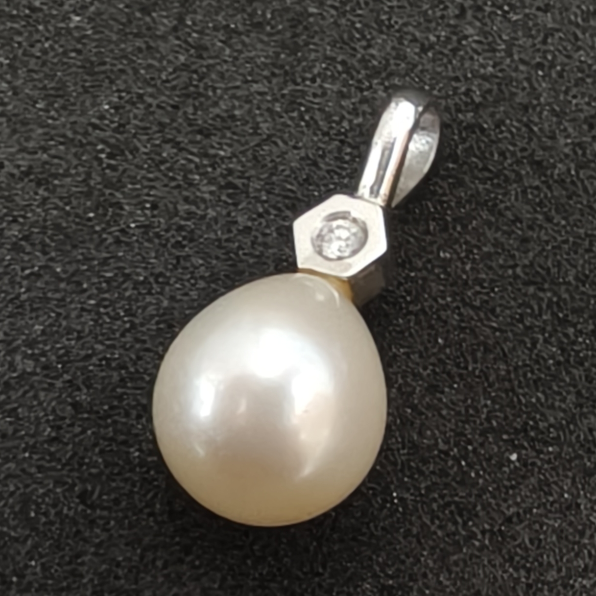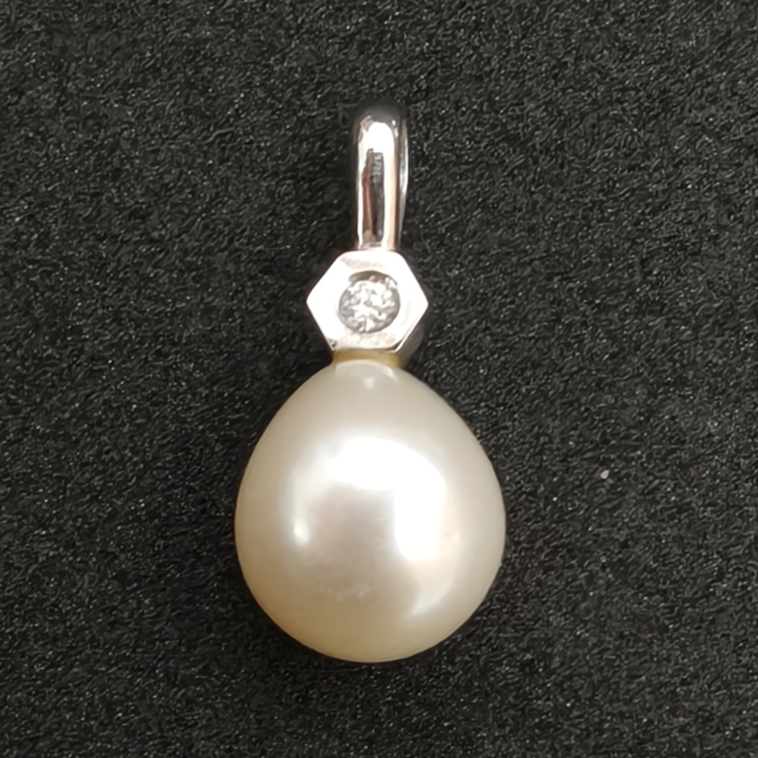 Colgante oro balnco con diamante y perla. Tipo: Colgante. Género: Unisex. Material: Oro 18 K. Medida: 20mm de largo (aproximadamente). Peso: 2.12 gramos. Piedras: diamante. Estado: perfecto estado, segunda mano
