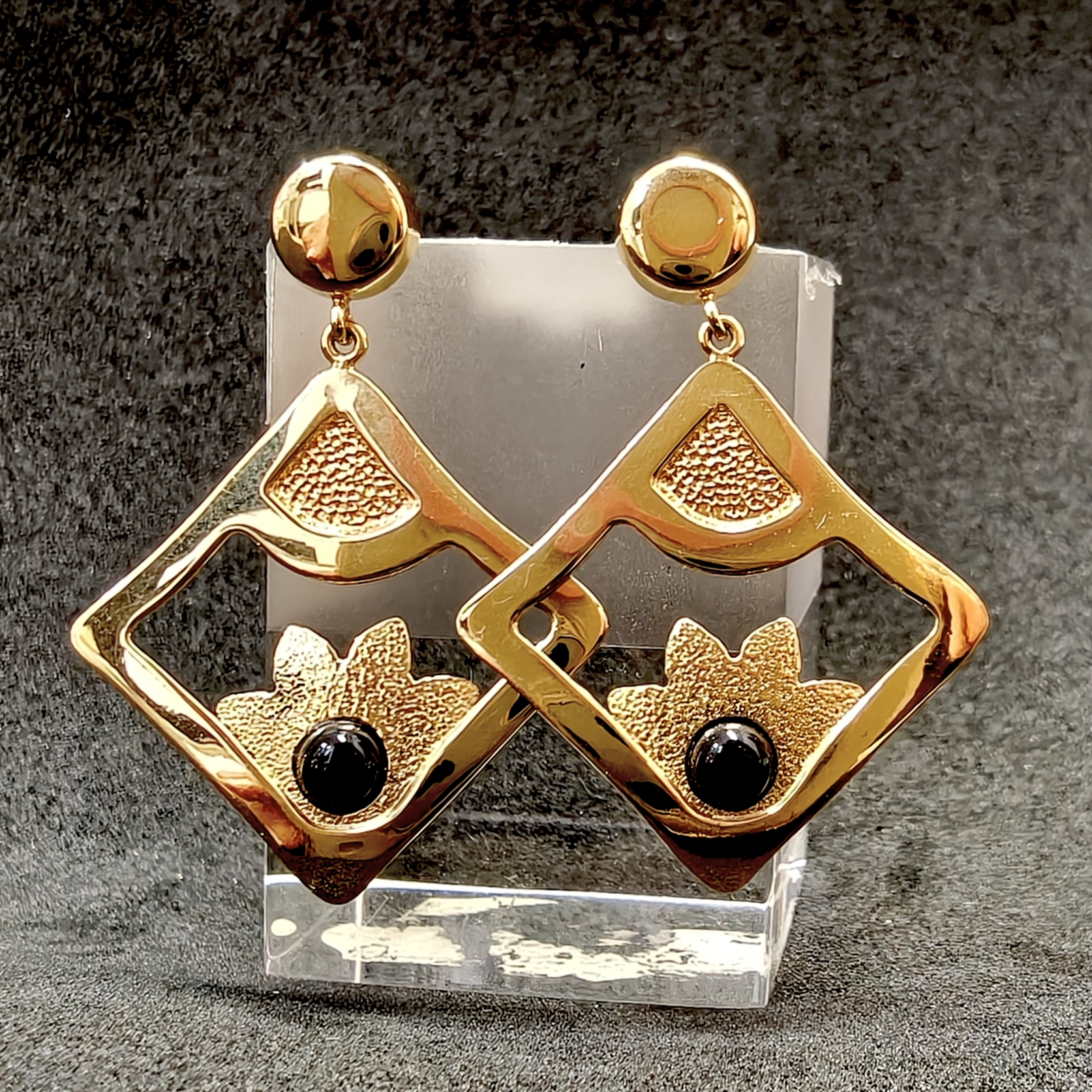 Pendientes oro 18k rombo con flor labrada con piedra negra.
